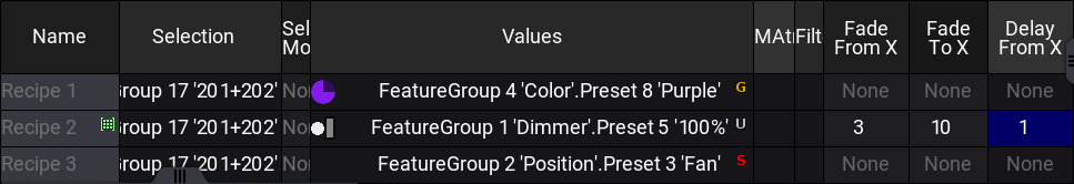 Scroll the recipe to the right to show the four "Fade" and "Delay" columns.