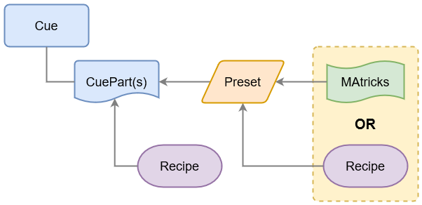 This shows us that a recipe can be stored in a cue part or preset, which can then be used in a cue part. It also shows an element called "MAtricks", which is currently out of the scope of the quick start guide.