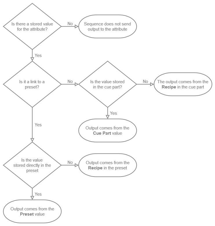 Values stored in the cue part have higher priority than the cue part recipe value. Values stored in the preset have a higher priority than the preset recipe values. Storing a preset to a cue part creates the preset reference to the preset so in that case the output is decided by the preset priority.