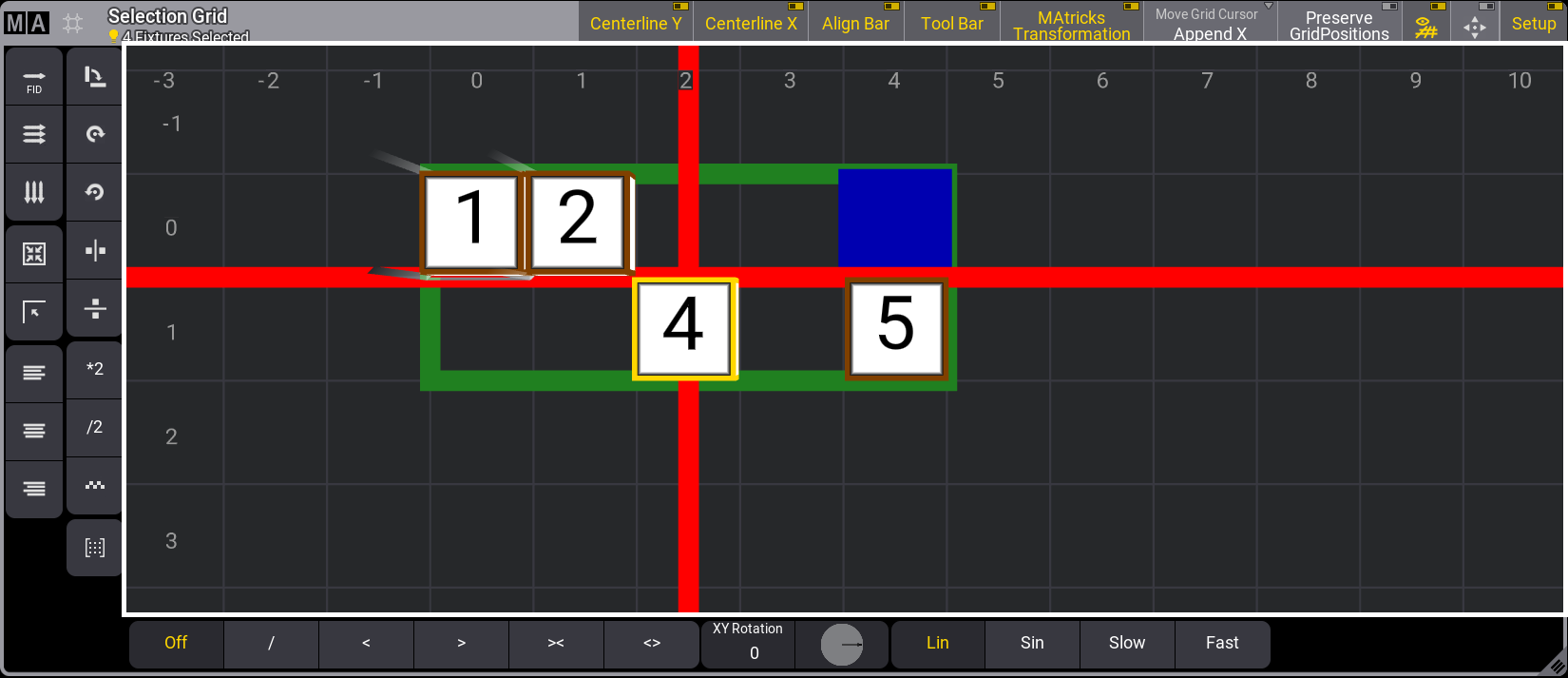 When the Setup mode is enabled, fixtures can be moved in the selection grid.