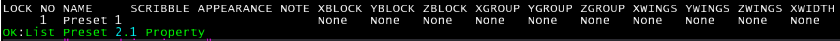 The property names are on the top row: LOCK, NO, NAME, SCRIBBLE, APPEARANCE, NOTE. Scroll to the right of the Command Line History window to see all the properties for preset 2.1. The row underneath displays the property values.