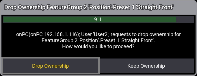 This pop-up also has a countdown of 10 seconds. If the time runs out, then the ownership is dropped. This is the default action that allows other users to get objects currently owned by a user who has left the stations and simultaneously allows a user to keep ownership as an active choice.