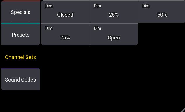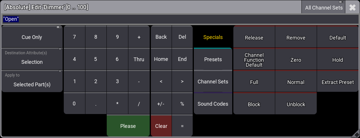 - ChannelFunctionDefault: Tap to set the attribute to the default value of the selected channel function. For more information see ChannelFunctionDefault Keyword.