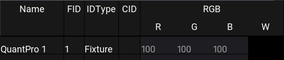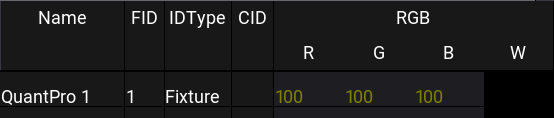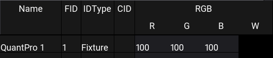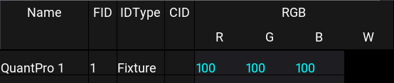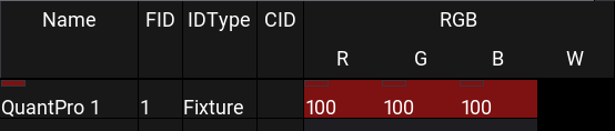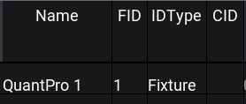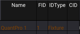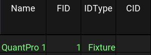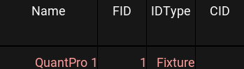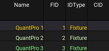 White fixture names and IDs on a dark gray background indicate fixtures that are not selected. It is the default color combination.