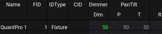 There is an individual fade time on the dimmers of these two fixtures. The top value with a green background comes from the programmer. The bottom value with green text comes from the current cue in a selected sequence.