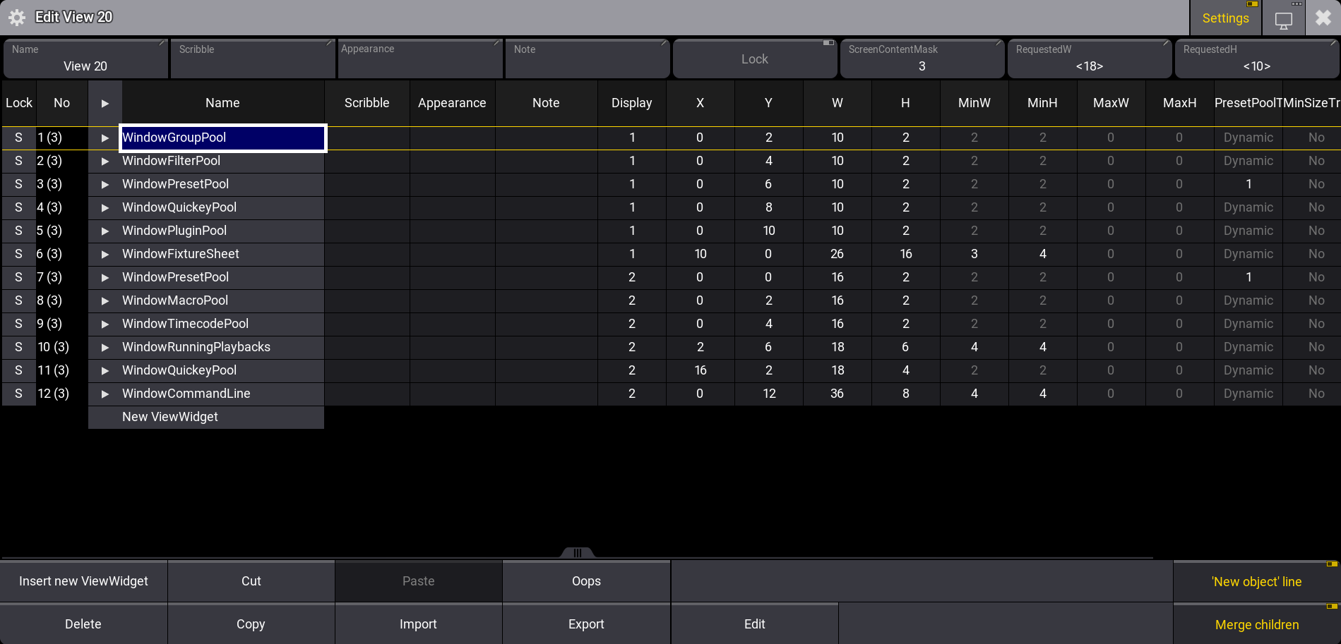 This editor has a table view with each window as a row and all the different settings for the windows in columns. The window objects (called "ViewWidget") can be unfolded by tapping the white arrow. This exposes all the settings for the window.